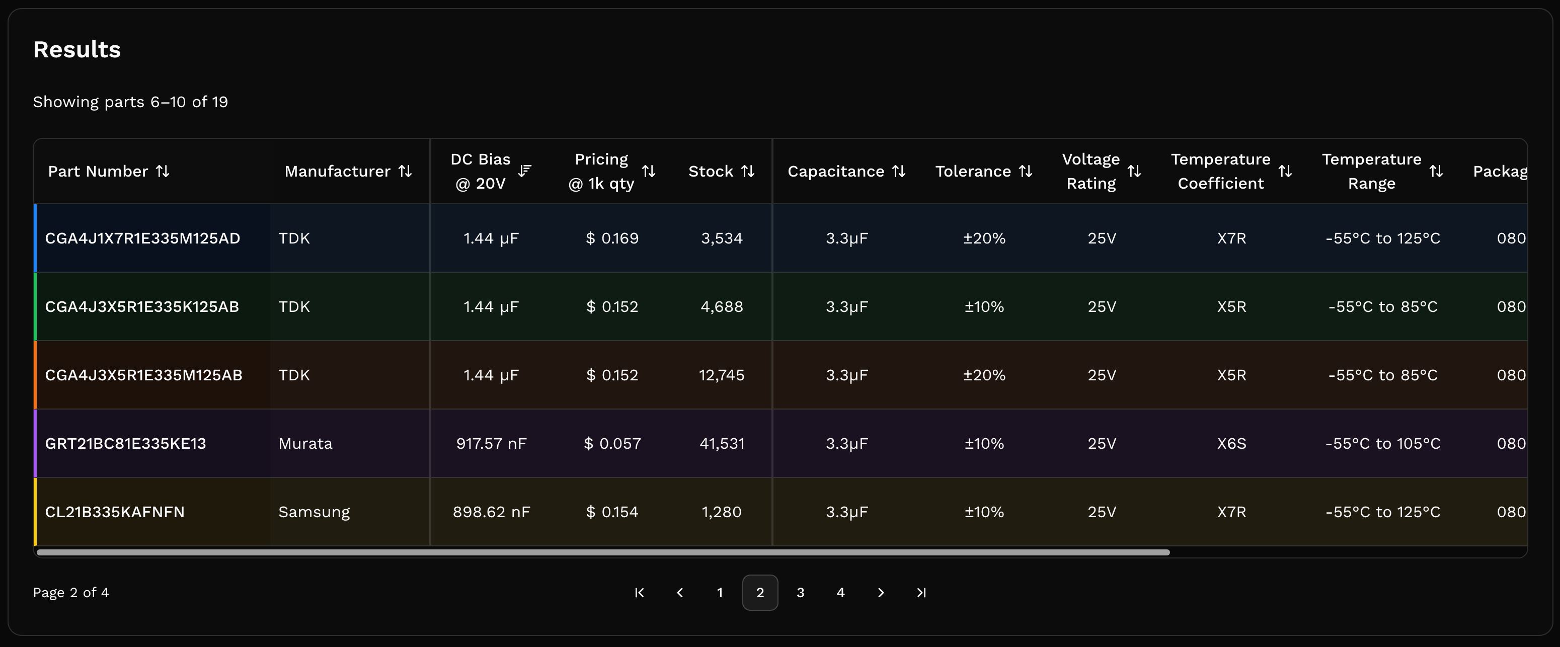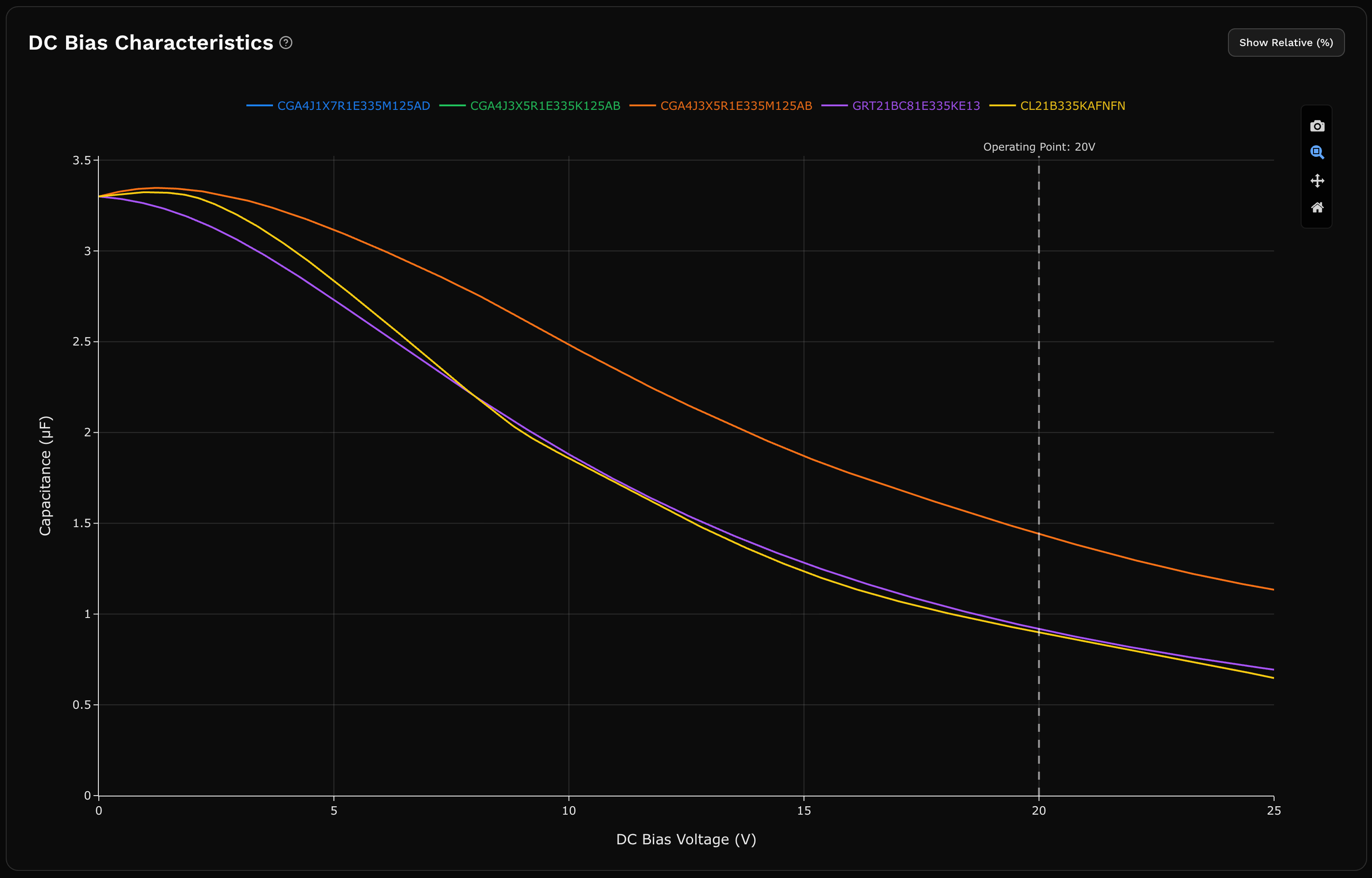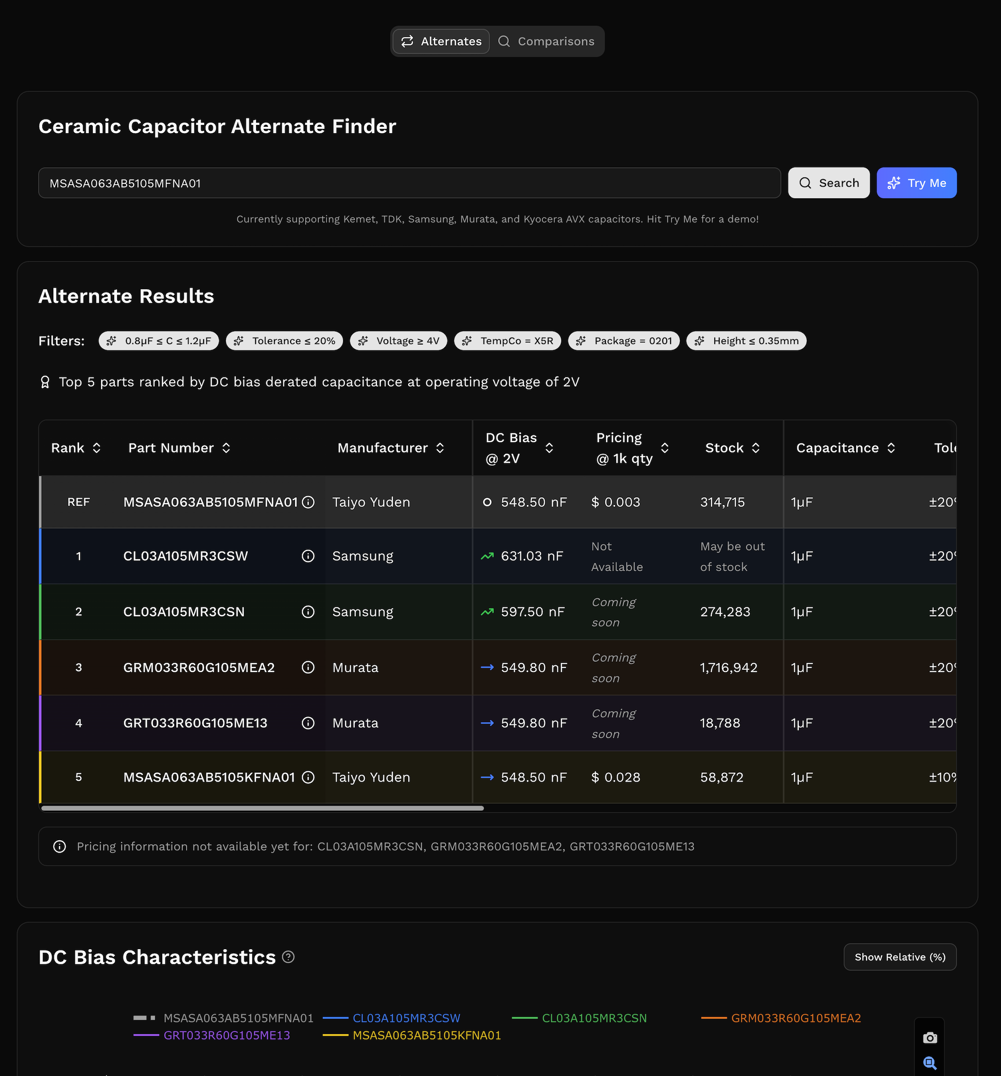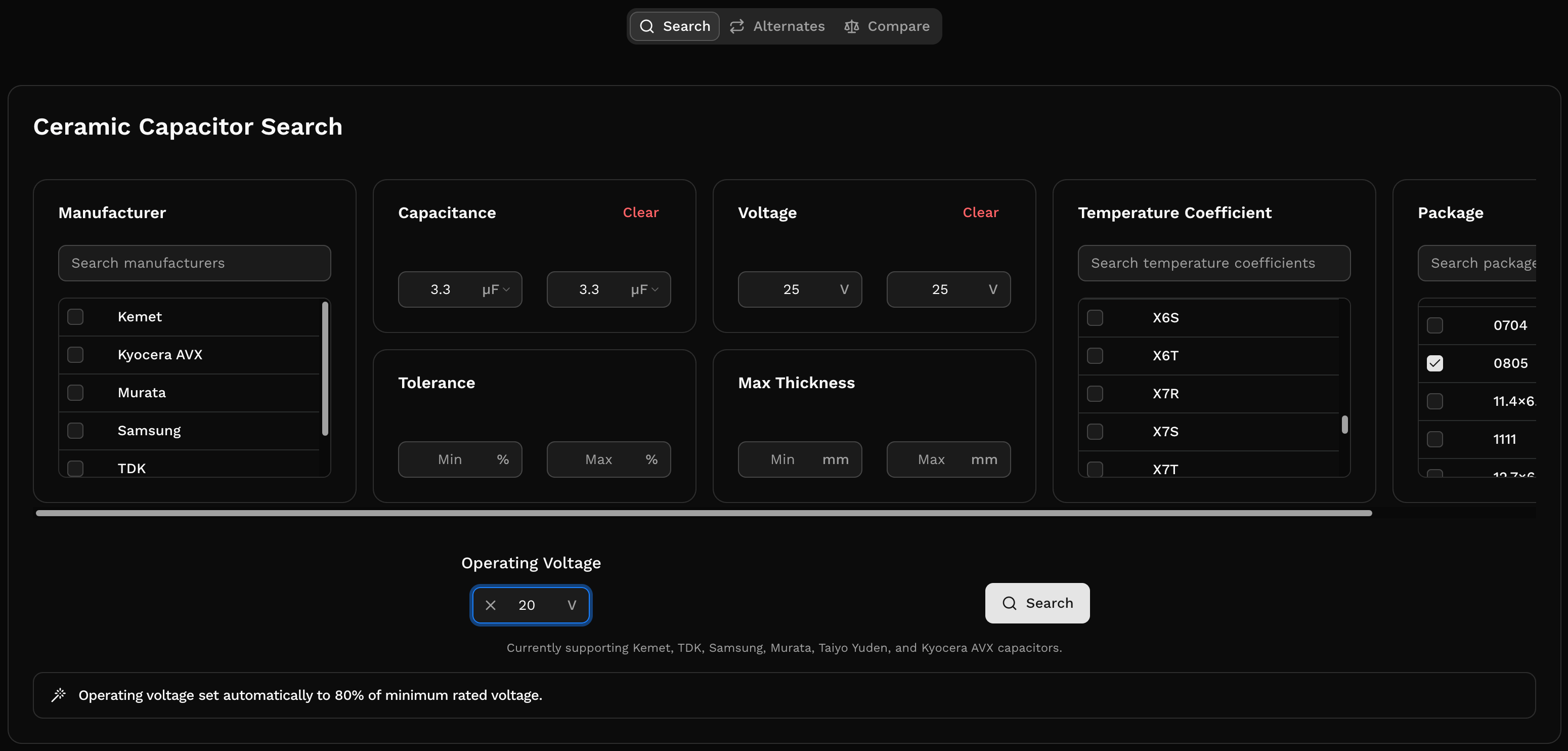 Specify your operating voltage to auto-calculate DC bias capacitance retention. It shows up directly in the results table as a sortable column.